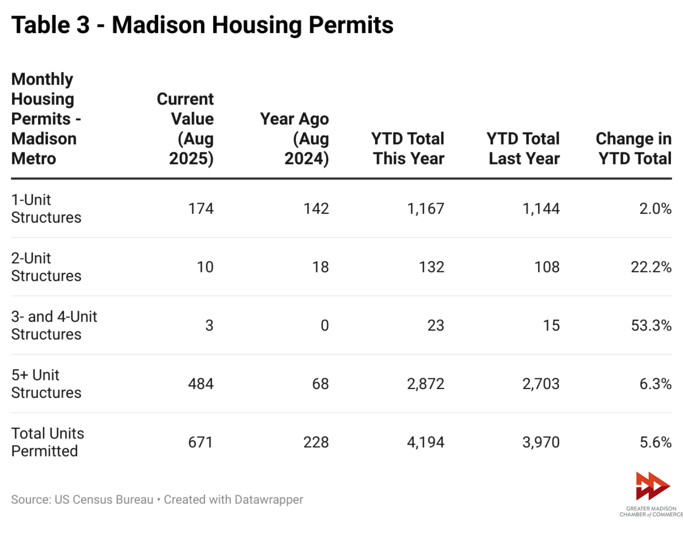 Due to the government shutdown earlier this year, Census Building Permits data for September has not been released, so this section will only cover building permits up to August (Table 3). The Metro has permitted more housing units this year YTD than last year, with nearly 4,200 housing units approved – an increase of about 5.6%.