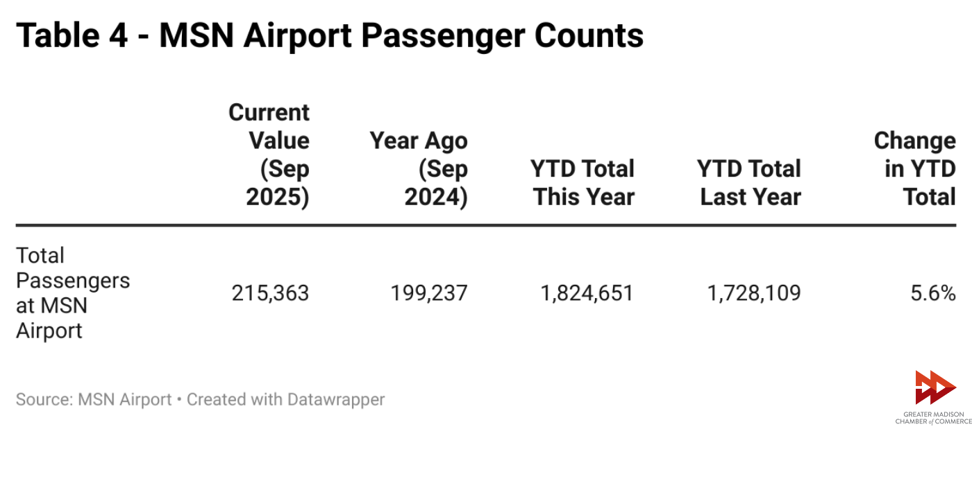 This year’s Dane County Regional Airport passenger counts YTD surpassed pre-pandemic records and are on track to be the airport’s best year yet (Table 4). For more information on how the airport is doing and what its future plans are, the Chamber recently hosted an edition of our Lunch(UP)date program with the airport’s new Executive Director, Mark Papko.