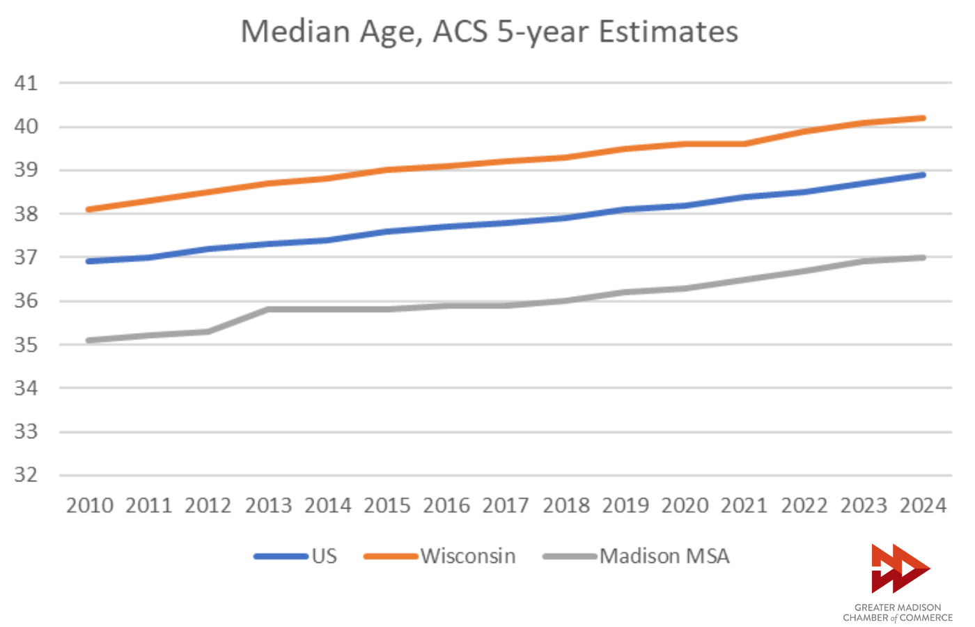 Every measure of workforce age in the ACS shows that Greater Madison is younger than Wisconsin and the U.S., illustrating the region’s competitive positioning against aging workforce trends affecting the nation.
