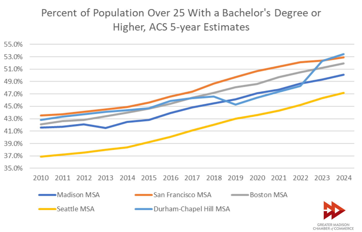 The 2024 ACS five-year estimates showed for the first time that a majority of people (50.1%) living in the Madison Metro aged 25 years old or older have a bachelor’s degree or higher (Fig. 4). This gives our metro the 28th highest proportion of university-educated adults out of the 935 total areas measured in the country, putting the region in the top 3%. This proportion of bachelor’s degree holders soars above Wisconsin’s (33.4%) and the country (35.7%) and is in the same league as leading high-tech regional economies such as San Francisco, Boston, Seattle and the Research Triangle.