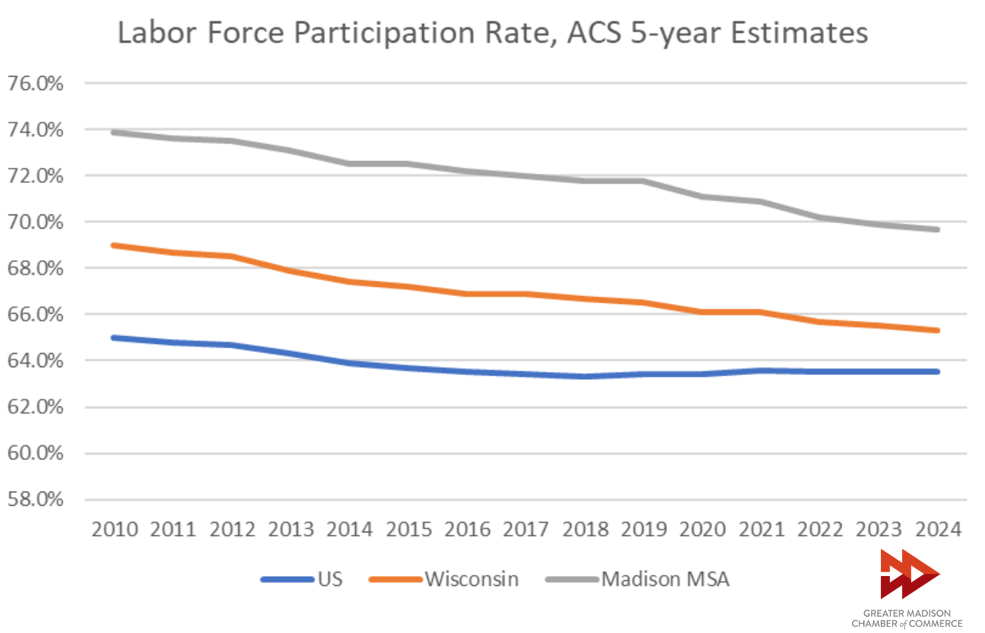 One consequence of an aging labor force is a decrease in the proportion of the population that is employed or looking for work, known as Labor Force Participation (Fig. 3). This rate tends to peak among people aged 25 to 54 and decrease outside that range. If a population has a lower share of people in these prime working years and a larger share of people outside of them, its labor force participation rate tends to decline. Labor force participation rates in Wisconsin have typically been above those of the nation’s, with the Madison Metro being above that mark. This trend has not changed in the 2024 ACS but the differences in rates have narrowed since 2010.