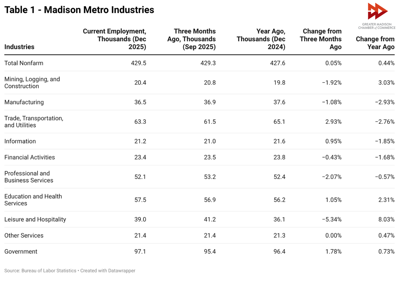 Overall employment in the Greater Madison region remained relatively steady, with job growth of 0.44% over the year. This is stronger than the job growth seen in 2024 of only 0.02%, but less than the rate of growth in 2021, 2022 and 2023, which saw over 2% growth. These numbers reflect statewide and nationwide patterns of reduced job growth in 2024 and 2025.