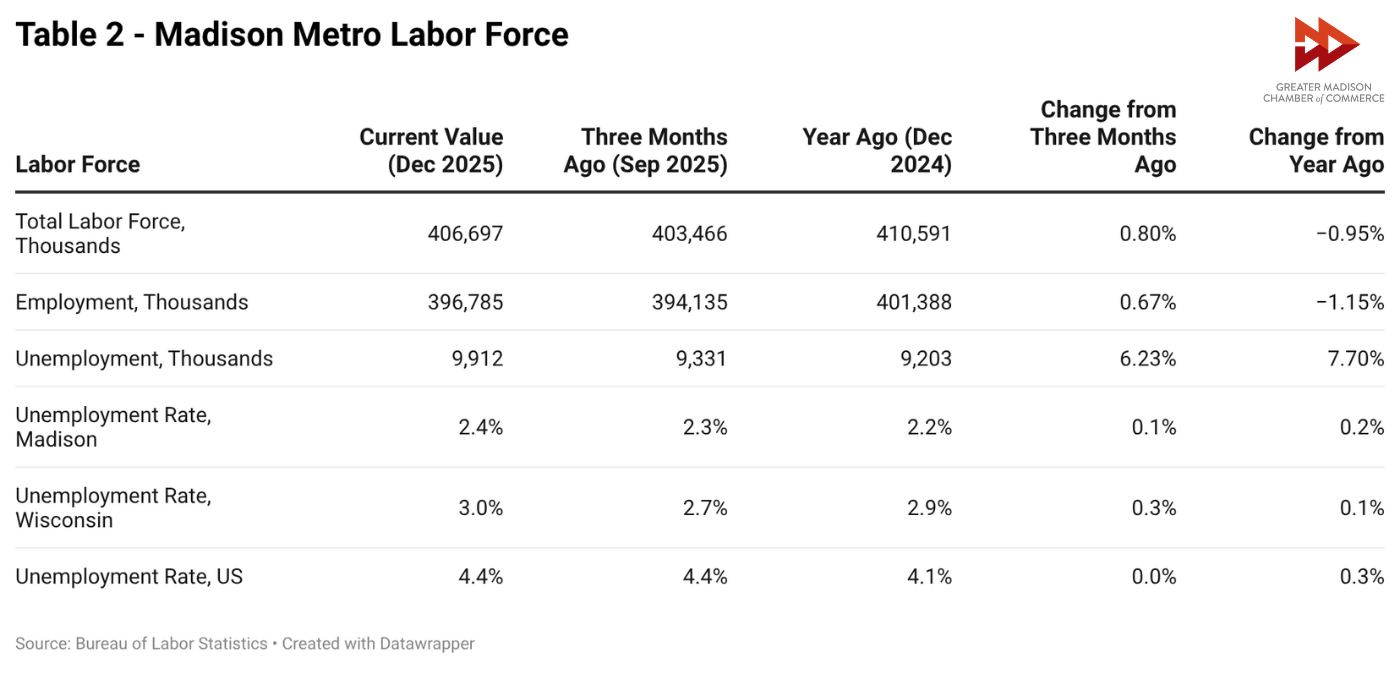 The region’s workforce saw a modest retraction in line with the slowdown in demand for jobs. As with the jobs report, this is reflective of larger statewide and nationwide trends and is not unique to Greater Madison. The number of employed people in the region declined by about 1% in 2025, as did the total labor force. This resulted in a roughly constant unemployment rate over the year, ending at 2.4% in December, the 13th lowest among the 387 metropolitan areas in the nation.