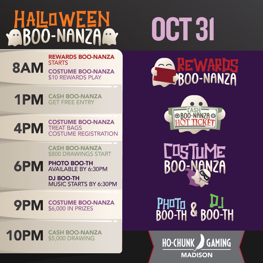 Join us for our free Cash BOO-Nanza on Friday, Oct 31. 18 winners will receive $800 in cash, with one lucky grand prize of $5,000. You can also enter our free costume contest, where we’re giving away $6,000 in cash prizes. Plus, we’ll have a DJ, a free photo booth, and free Rewards Play for those who arrive wearing a costume. Bring your Halloween spirit to… Ho-Chunk Gaming Madison.